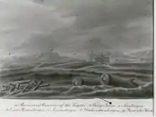 While under the command of Captain Valentine Edwards,[10][11] Sceptre was caught at anchor in a storm on 5 November 1799 along with seven other ships in Table Bay, near the Cape of Good Hope.[11] At 10:30am, the captain ordered the topmasts struck, and the fore and main yards lowered in order to ease the ship in the strengthening winds.[11] At midday, the ship fired a feu de joie on the occasion of the Gunpowder Plot, suggesting no apparent apprehension about the oncoming storm.[11] However within half an hour, the main anchor cable parted and despite the laying of a secondary one, this also broke.[11] At approximately 7pm, the ship was driven ashore onto a reef at Woodstock Beach at the site of the present-day Royal Cape Yacht Club and battered to pieces. One account states approximately 349 seamen and marines were killed or drowned. One officer, two midshipmen, 47 seamen, and one marine were saved from the wreck, but nine of these died on the beach.[12] The ship was wrecked a few hundred meters from the spot where a similar sized Danish warship, the Oldenborg was also wrecked in the same hurricane.[1]
