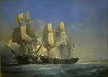 The enemy vessel proceeded to stay by Lilly's stern and to use her long guns at ranges Lilly's carronades could not match. The fire from the enemy vessel killed Compton and so damaged Lilly's rigging that she lost her ability to manoeuvre. Seeing that the enemy vessel was preparing to board, Lieutenant Samuel Fowler, who was now in command, wanted to surrender, but the warrant officers objected. As the two vessels came alongside Lily was finally able to fire a broadside, which the French returned, and French fire killed Fowler. The British repelled several French attempts to board but eventually the French prevailed. Lilly's casualties were Compton and Fowler killed, and 16 men wounded.[16]