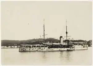 After this, the ship made two voyages around the Asia-Pacific to show the flag. The first began on 10 August 1909 when the ship, together with the Maarten Harpertszoon Tromp and the Koningin Regentes, departed from Batavia and sailed to China, Hong Kong, Japan and the Philippines.[7] The second voyage was undertaken the following year, when De Ruyter and both her sister ships, Koningin Regentes and Hertog Hendrik, sailed to Australia after leaving the port of Surabaya on 15 August 1910. Brisbane, Melbourne, Sydney and Fremantle were included among the ports that were visited during this journey.[8]