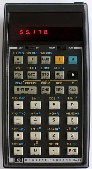 The HP-34C continuous memory calculator was an advanced scientific programmable calculator of the HP 30 series. It was produced between 1979 (cost US$150) and 1983 (cost US$100).