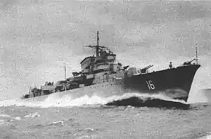 The destroyer had a length overall of 112 metres (367 ft 5.4 in) and 107 m (351 ft 0.6 in) between perpendiculars, a beam of 11.2 m (36 ft 8.9 in) and a draught of 3.4 m (11 ft 1.9 in).[4] Displacement was 1,880 tonnes (1,850 long tons; 2,070 short tons) standard and 2,400 tonnes (2,400 long tons; 2,600 short tons) full load. Power was provided by two Penhoët boilers feeding two de Laval geared steam turbines rated at 44,000 shaft horsepower (33,000 kW) and driving two shafts. Design speed was 35 knots (65 km/h; 40 mph). A single funnel was fitted. 300 long tons (300 t) of oil were carried, giving a design range of 2,500 nautical miles (4,600 km; 2,900 mi) at 20 kn (37 km/h; 23 mph). The ship's complement was 210 officers and ratings.[3]