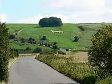 At the top of the hill is a car park where the Ridgeway crosses the B4041 road, and a footpath stretches from there down to the horse, making the horse accessible to the public.[2] Ironically, many real horses often roam the field.[3] It has been suggested that the stones for Stonehenge and Avebury may have come from a field of sarsen stones just to the south east of its location.[3] The expression "as different as chalk and cheese" is sometimes believed to refer to the land divided by Hackpen Hill. The hill forms the boundary between the high chalk downs to the south of it and the clay cattle country to the north, where cheese is a product of the milk from the cattle, so the two areas "are as different as chalk and cheese."[4] Hackpen White Horse was not the only hillside shape cut to commemorate Queen Victoria; in 1887, for her Golden Jubilee, a hillside row of trees were planted in the shape of a "V" in Westmeston, Sussex.[5]