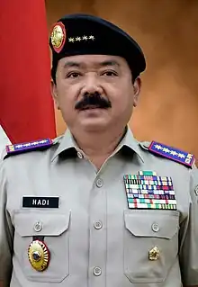 Air Chief Marshal (Ret.) Hadi Tjahjanto (born 8 November 1963) is the Minister of Agrarian and Spatial Planning of Indonesia under President Joko Widodo's Onward Indonesia Cabinet. He is a former officer in the Indonesian Air Force who previously served as the 20th Commander of the Indonesian National Armed Forces. An alumnus of the Indonesian Air Force Academy and Flight School, he was appointed by president Joko Widodo in 2017 as the Commander of the Armed Forces (Panglima).[1]