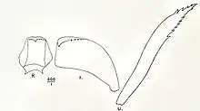 The rhachidian tooth (R) of the radula has a subquadrate body, with rounded posterior corners, enlarged sides and a short, reflected cusp, with a few denticles. The lateral (l) is subtriangular, with a short, reflected cusp, with small denticles at the distal margin. I can detect no more teeth, belonging with certainty to the median part. The uncini (U) are long, slender, with distinct smaller teeth near the top. (described as Basilissa sibogae) [2]