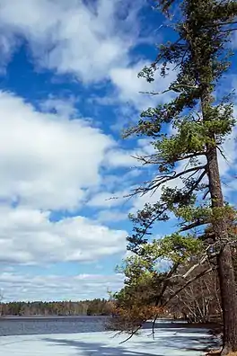 Hiking trails, some converted out of a former railway (the Lowell and Lawrence Railroad), encircle the pond.