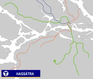Hagsätra metro station is on the Green line of the Stockholm metro, located in Hagsätra, Söderort. It is the end station for line 19. The station was inaugurated on 1 December 1960 when one-station extension from Rågsved was completed.[2] The distance to Slussen is 10 km (6.2 mi).