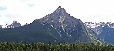 Hagwilget Peak is the northernmost mountain in the Rocher Déboulé Range in northern British Columbia, Canada. The 2,076-metre (6,811-foot) mountain summit is conspicuously situated immediately south of Hazelton, British Columbia. Overlooking New Hazelton, it rises 1,770 m (5,807 ft) above the surrounding valley. Precipitation runoff from the mountain drains into the Skeena River and Bulkley River. Based on the Köppen climate classification, Hagwilget Peak is located in a subarctic climate zone with cold, snowy winters, and mild summers.[3] Temperatures can drop below −20 °C with wind chill factors below −30 °C. Originally labelled Nil-ke-auda on George Dawson's map for an 1879–80 report for the Geological Survey of Canada, it was later adopted as Awillgate Peak in 1917. The spelling changed to Hagwilget Peak on 1 February 1963, when officially adopted by the Geographical Names Board of Canada to conform with the modern spelling of the namesake village, Hagwilget.[4][2]