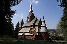 Hahnenklee is chiefly known for the Protestant Gustav Adolf Stave Church, built by the architect Karl Mohrmann (1857-1927) in 1908. The adjacent bell tower was added in 1975 for extending the carillon up to the current 49 bells.