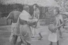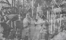 Hajongs are endogamous[1] people. In Hajong society matriarchy declined with the influence of Hinduism, leading towards the growing dominance of patriarchy in Hajong society. When intimacy develops between a boy and a girl without the knowledge of their parents, they are married to each other, provided that they do not belong to close maternal and paternal kinship. Exorbitant dowry system was absent in the Hajong society. The Hajongs would give a tolerable bride price or groom price called pon.[2] Marriage is usually negotiated by the parents through a matchmaker known as Jahu or Jasu. Temporary shrines are set up on the yard, in front of which the wedding ceremony takes place. Four banana trees act as the pillars of the shrine, the shrine is decorated with paper cuttings with intricate motifs. Hajong marriages of the khutri or warrior class have a sword ritual to symbolise the mani katri, a sword given by a girl to her husband to protect her.