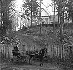 Joseph Goff (1778-1875) was a wealthy landowner who inherited the estates of his father in 1833.[16] In 1816 he married Jane Stannus (1792-1874) who was the daughter of Captain Thomas Stannus. The couple had nine children. An engraving was made of the house by the Goff family which is shown. When Joseph died in 1875 the will stated that the property would be passed to his eldest son Joseph Chandler Goff who had married Lady Adela Knox (1833-1911), daughter of Sir Thomas Knox, Earl of Ranfurly. However he predeceased his father so it was inherited by the grandson Joseph Granville Stuart Goff (1851-1881). He appears to have taken control of the estate for some years but died at the age of thirty in 1881. Hale Park was then inherited by his brother Gerald Lionel Joseph Goff (1855-1899) who was a Colonel in the Army.[17] He did not expect to be the heir so he continued his military career and died in the Boer War in 1899. It seems that the estate was run for many years by his mother Lady Adela Goff whose picture is shown. She is in a pony trap with St Mary’s Church in the background. When she died in 1911 the property was rented to Geoffrey Skeffington Smyth.[18]
