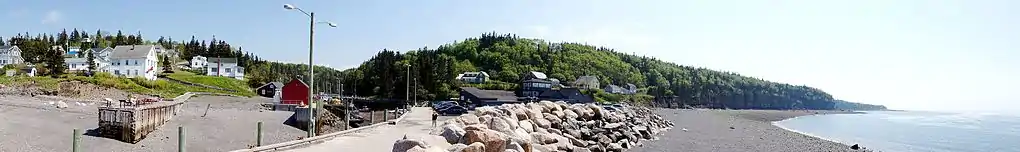 A shipyard produced many schooners and some square rigged vessels, the largest being the barque Jenny Bertaux, built in 1864.[4] A notable early resident was Ransford Dodsworth Bucknam, a local mariner whose 19th century career took him all over the world including a post as an admiral in the Turkish Navy. Growth of the village slowed in the 1870s as the depletion of timber reserves ended the lumber trade and the arrival in 1869 of the Windsor and Annapolis Railway in the Annapolis Valley and drew away agricultural shipments. Shipbuilding declined with the lack of timber and introduction of steamships although there was a brief revival in World War I.[5] The harbour continued as an inshore fishing port and small coastal shipping centre for coastal schooners and small steamers. The Canadian federal government took over operation of the wharves in the early 1900s and built a lighthouse on a small breakwater at the eastern harbour entrance in 1911.[6] The larger western breakwater was extended in 1920 and heavily damaged by a storm in 1962.[7] After World War II, coastal shipping ceased but the picturesque harbour drew many local cottagers and became a favoured place to view the dramatic change of the Bay of Fundy tides.