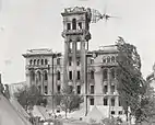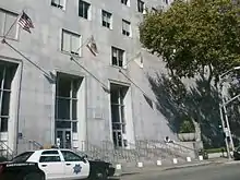 The first Hall of Justice (1900–06) was opposite Portsmouth Square, at the southeast corner of Kearny and Washington, occupying a building originally built in 1851 as the Jenny Lind Theatre and purchased by the city in 1852 for use as the City Hall. While a new City Hall was being constructed between 1872 and 1899 at Civic Center, the old Jenny Lind building was rebuilt as the Hall of Justice; the cornerstone was laid on December 19, 1896.[2] By 1898, the editors of the San Francisco Call derided the slow pace of work as "The Haul of Justice", concluding the contractor had underbid the job and was intent on delaying the completion by ordering numerous changes;[3] a grand jury would later ask Mayor James D. Phelan and the San Francisco Board of Supervisors to "grant no further extension" of the contractors after October 1 of that year.[4] Also that year, when bubonic plague broke out in neighboring Chinatown, residents there blamed the tall tower of the Hall of Justice, which they claimed "had aroused the evils of the air".[5] Work was completed in 1900 and the first official business was conducted there on September 19, although the upper floor jail remained unfinished; despite this, the Call wrote "the building is the best San Francisco ever had in its history".[6][7] It was heavily damaged following the April 1906 San Francisco earthquake and fire.