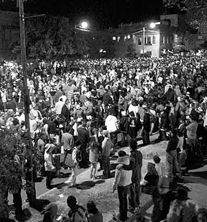 Halloween on Franklin Street is a yearly tradition in Chapel Hill, North Carolina, that encompasses a massive gathering on Franklin Street, the cultural hub of the town. The Halloween celebration began in the early 1980s as a considerably smaller event, involving Chapel Hill residents and college students from The University of North Carolina.[1] Attendees of the event dress up in creative Halloween costumes and walk up and down Franklin Street celebrating the holiday. Since its beginnings, the event had grown in size every year until 2008. Although not sponsored by the Town of Chapel Hill,[1] the celebration has become an attraction for visitors from across the South. Between 2004 and 2007, it was estimated that about 80,000 people converged on Franklin Street for the event,[2] while Chapel Hill is estimated to have a population of 54,492 as listed in the 2007 census, evidence of the number of people who make the trip to Chapel Hill to attend. Because of the size of the celebration, the Town of Chapel Hill closes Franklin Street to all vehicular traffic and prohibits parking anywhere near downtown.[1] Along with the big crowds come safety issues, with some of the biggest concerns being alcohol poisoning and gang-related violence. To deal with these issues, hundreds of police officers patrol the downtown area throughout the entire night. In 2007, approximately 400 police officers were deployed to Franklin Street to ensure that nothing got out of hand.[3] In 2008, the Town of Chapel Hill implemented new measures to attempt to cut down on the size of the Halloween celebration in an action dubbed "Homegrown Halloween" to reduce the crowd size and discourage people from out of town to come to Chapel Hill.[1] The shuttle service that had formerly transported people from park and ride lots to Franklin Street was shut down and the results of Chapel Hill's efforts showed when about 35,000 people showed up for the event.[4]