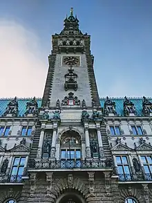 On the outside the architectural style is Neo-Renaissance, which is abandoned inside for several historical elements.[5] It is one of the few completely preserved buildings of historicism in Hamburg.[6] The roof is made of copper which, over time, has reacted with carbon dioxide and water and turned green, showing the age of the building.[7] Built in a period of wealth and prosperity, in which the Kingdom of Prussia and its military defeated France in the Franco-German War and the German Empire was formed, the look of the new Hamburg Rathaus was intended to express this wealth and also the independence of the State of Hamburg and Hamburg's republican traditions.[5] The city hall has a total area of 17,000 m2 (182,986 sq ft), not including the restaurant Ratsweinkeller, now called Parlament, of 2,900 m2 (31,215 sq ft). The tower is 112 metres (367 ft) high with 436 steps. It is a common misconception that Hamburg Rathaus has more rooms than Buckingham Palace (647 vs. 775), on a building area of 5,400 m2 (58,125 sq ft).[8][9]
