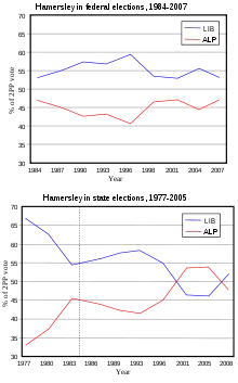 At federal level, Hamersley is within the Division of Stirling, a marginal seat which historically has alternated between the Liberal Party and the Australian Labor Party. It has been held since 2004 by Michael Keenan of the Liberal Party.[73] At polling place and subdivision level, Hamersley has supported the Liberal Party at every election since its first in 1972, the only exception being the 1983 election.[74] In the 2001 election, the booth at East Hamersley Primary School was only won by the Liberal Party with a 0.3% two-party-preferred majority. Hamersley was in the Division of Cowan for elections held between 1984 and 1996.