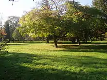 Hampton Court Park, also known as Home Park, is a walled royal park managed by the Historic Royal Palaces.[1] The park lies between the gardens of Hampton Court Palace and Kingston upon Thames and Surbiton in south west London, England, mostly within the post town of East Molesey, but with its eastern extremity within the post town of Kingston. In 2014, part of the park was designated a biological Site of Special Scientific Interest (with Bushy Park and Hampton Court Golf Course). It takes up most of the final (lowest) meander of the non-tidal reaches of the River Thames and is mainly divided between a golf course, meadows interspersed with trees used for deer, seasonal horse grazing and wildlife. A corner of the park is used annually for the Hampton Court Flower Show and the part nearest to the palace has the Long Water — an early set of hydro-engineered ponds or lakes, fed by water from the distant River Colne, as are the bodies of water in the neighbouring park, Bushy Park.[2][3][4]