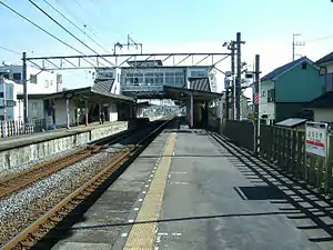 This station has an elevated station building, with two opposed side platforms serving two tracks located on the ground level.