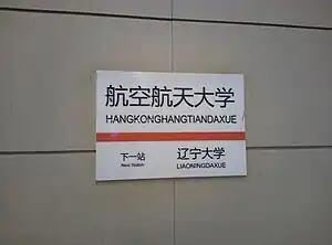 Hangkonghangtiandaxue (Chinese: 航空航天大学站; pinyin: Hángkōnghángtiāndàxué Zhàn) is a station on Line 2 of the Shenyang Metro.[1] The station opened on 30 December 2013.[2] The station is named after the nearby Shenyang Aerospace University.