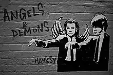 ![]() 2012 "Angels and Demons" street art by Hanksy, based on Banksy's 2002 "Pulp Fiction" | |