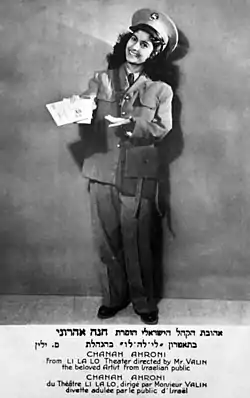 In April 1956, she performed in Paris, London, and other cities in Europe.[11] In March 1957, she sang for Elizabeth of Bavaria, the Queen of Belgium.[12] Aharoni continued her tour in the Americas and had brief success in Mexico.[13] In May 1958, she returned to Israel and performed in concerts and theaters. In November 1958, she returned to the USA for another tour.[14] In January 1960, Aharoni recorded an album of Israeli folk songs, Songs of Israel (1960), for Decca Records,[15] which sold more than half a million copies.[16] In March 1960, she performed at New York City's The Town Hall.[17] Later this year, she went on to perform for six weeks in Las Vegas.[18] In early 1962 she appeared on Ed Sullivan's program.[19]