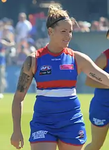 Hannah Scott (born 10 March 1990) is a retired Australian rules footballer who played for the Western Bulldogs in the AFL Women's competition (AFLW). She was drafted by the Bulldogs with the club's third selection and the twenty first overall in the 2016 AFL Women's draft.[1] She made her debut in Round 1, 2017, in the club inaugural match against Fremantle at VU Whitten Oval.[2] It was revealed that Scott had signed a contract extension with the club on 16 June 2021, after playing 5 games for the club that season.[3] In May 2022, Scott retired from the game after not playing a single game in 2022 AFL Women's season 6 due to injuries.[4]