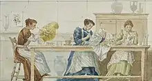 The sisters, plus another, painting in the Doulton studio, c. 1893. Probably Florence at right and Hannah centre.