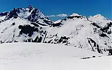 Hannegan Peak is a 6,191-foot elevation (1,887 m) mountain summit located in the Skagit Range, which is a subset of the North Cascades in Whatcom County of Washington state.[4] It is situated immediately north of Hannegan Pass, and 2.2 mi (3.5 km) north of Ruth Mountain in the Mount Baker Wilderness, which is managed by Mount Baker-Snoqualmie National Forest. Banning Austin and R.M. Lyle made the first ascent of Hannegan Peak in 1893 while surveying for a possible road across the Cascades over Hannegan Pass to Whatcom Pass. This peak was named in association with Hannegan Pass, which in turn was named for Tom Hannegan, State Road Commissioner at that time.[5] Although no road was built, a four-mile trail leads hikers to the pass, and another one-mile path leads to the summit. Peaks which can be seen from the summit include Mount Shuksan, Ruth Mountain, Mineral Mountain, Mount Baker, Mount Sefrit, Mount Larrabee, Granite Mountain, Mount Chardonnay, Mount Rexford, the Picket Range, and many more.