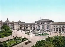 As the first station was built at street level and therefore hindered the expansion of the city, 8 km (5.0 mi) of railway track were laid for a new rail network that was grade-separated from the street system. In addition, the new station had a long system of tracks. After preparatory work in 1873 to relocate the workshops to Leinhausen and the marshalling yards to Hainholz and the construction of freight diversion routes, construction of the core network, which still exists, began in 1875.[4] The new station building was designed by Hubert Stier in the Renaissance Revival style. It was again a symmetrical building with a main hall and two wings, each of which was completed by a corner building. The eastern corner building with its Kaiserzimmer (literally 'Emperor's room') had a separate driveway. The building was designed in yellow brick with red brick stripes and a sandstone base. The four platforms with seven platform tracks and two through tracks were spanned by two halls with a 37-metre (121 ft) span. After the demolition of the nearly 30-year-old station building, the construction of the new station began in April 1877. It was opened on 22 June 1879 after 26 months of construction. Access to the platforms was via three tunnels and there were two more tunnels for the transport of luggage and for postal traffic. The system of tracks finished in 1883 comprised seven platform tracks and two central through tracks for freight trains. The train sheds consisted of two separate halls, each 37 m (121 ft) wide and 167.5 m (550 ft) long with a 9.25 m (30 ft 4 in) wide space between them for the two through tracks. The construction cost 12.7 million marks for the buildings and 22.5 million marks for the entire station precinct.[5]