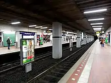 The construction of the Hanover Stadtbahn caused far-reaching alterations to the station. Since the entire station had to be operated during the reconstruction, construction was only possible by blocking tracks. Between July 1969 and the spring of 1973, a sixth platform was built on tracks 13 and 14.[7] Upon completion, two tracks were blocked from 1970 to 1975, through which the Stadtbahn tunnel and an overlying pedestrian level were built. For this, the central pedestrian tunnel was blocked and access to the platforms was via the re-opened side tunnel. As part of this restructuring the through track 6 was shifted to lie between platform tracks 8 and 9, while the through track 5 (now 40) remained at the old place (now 80). Then the station was rebuilt. The platforms including the canopies were also renewed. The western Lister Meile underpass between the main post office and the parcel post office located on Raschplatz was connected by long ramps for the transport of baggage and mail to the platforms.
