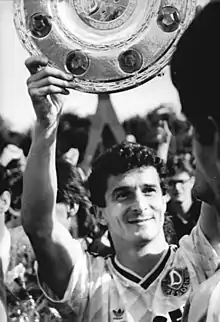Pilz lifting the East German Championship trophy in 1990