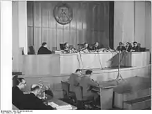 In July 1963, the trial, a show trial, was held in the Supreme Court of East Germany which was presided over by Heinrich Toeplitz.[66] Because an extradition of Globke to the East was unrealistic, the trial was not held with the expectation of holding Globke accountable for his crimes. It nonetheless still had propaganda value in publicizing his role in the Nazi era and in drawing attention to the continuity between the Federal Republic and the Nazi regime, in contrast to the self-styled antifascist image of the Democratic Republic.[67] On 23 July 1963, Globke was sentenced in absentia,[68][69] to life imprisonment "for continued war crimes committed with complicity and crimes against humanity in partial combination with murder".[70] In the trial and in the extensive reasons for the verdict,[71][72] the court tried to prove the alleged "similarity of essence of the Bonn regime" with Hitler's terror state.[73]