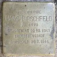 - This article is based on a translation of an equivalent article at the German Wikipedia, namely: Stolperstein für Hans Hirschfeld Archived 13 May 2016 at the Wayback Machine at "Deutschen Gesellschaft für Hämatologie und Onkologie".