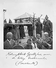 Kalmyks with holy instruments photographed by Kaarsberg, 1890.