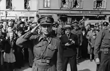 From Sweden Holtermann made his way to the United Kingdom where, in 1943, he assumed the rank of Oberst (Colonel) and took command of the Norwegian Army in exile's main unit – the Norwegian Brigade in Scotland. In 1944 Holtermann was transferred to lead District Command Trøndelag and returned to Sweden where he took part in Norwegian preparations for the coming liberation of Norway. After the German surrender in Norway on 8 May 1945 Oberst Holtermann led District Command Trøndelag over the border from Sweden on 10 May, together with two reinforced battalions of 2,570 Norwegian police troops, and took part in the disarmament and internment of the German occupation forces.[2][11][13]