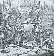 His reputation, however, started to decline as he was accused, among other things, of having betrayed the federal troops to Milan. Furthermore, his zeal for reform and the driving back of the Constaffel resulted in more and more opposition. The order to have the allegedly poaching farm dogs killed culminated in a peasant uprising that could only be resolved through federal mediation. However, after the mediation Waldmann had the agreement with the peasants rewritten (i.e. falsified), which led to another uprising, in which large parts of the urban population rose up.[7] Waldmann was captured and, after several days of torture, executed on April 6, 1489. Before the execution, the rebellious people accused him, among other things, of worrying only about the interests of his foreign patrons. Not only had their mayor caused the death sentence of allied confederates through the betrayal of a campaign in Valais and Lucerne, but now he even wanted to leave their city to the emperor so that the county of Kyburg could be handed over to him.[8] Waldmann was beheaded following accusations of financial corruption, foreign connections and sodomy.[9]
