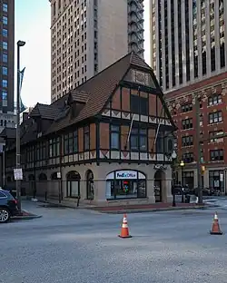 The building has 2.5 stories, with an exterior of brick and stucco. The building's upper floors have a half-timber style. It is decorated with the coats of arms of cities that were part of the Hanseatic League, along with a carved panel of a ship in full sail, the logo of the league.[2] Despite a large and prominent German population in Baltimore history, the Hansa Haus is the only early Germanic-style building in the city.[3]