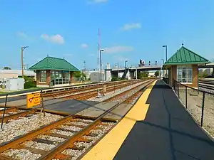 Hanson Park station in September 2016. The bridge for N. Central Avenue is visible in the background. The holding freight railroad tracks are to the far right.
