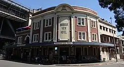 The Harbour View Hotel was one of a small number of pubs constructed in the Millers Point area following demolition by the Sydney Harbour Trust after land was resumed for the construction of the Sydney Harbour Bridge. In an area of trade facilities and industrialisation, hotels formed an important social role. The hotel's location, strategically sited at the south western end of the Harbour Bridge, is a physical reminder of the importance of meeting places associated with movement to and from the city. It is representative of many such buildings servicing the early local labour force and residents during the early decades of the 20th century. Aesthetically, the hotel exhibits consistent Inter-War period form and detailing and is mostly intact externally and internally. The structure is designed in the Inter-war Free Classical style. The hotel is strongly sited and curved around the corner with a classical banded and face brick masonry element. It makes a significant contribution to the local streetscape especially at its curved section of the site. The hotel has significance as part of a small number of popst-1920s purpose designed hotels that have survived in the city area which reflect the social character of the area during the early to mid decades of the 20th century. Of rare significance is the glazed tiles with signage to the lower portion below the awning level façade as few such examples of tiled signage remain in the CBD.[6][1]