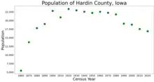 Hardin County is a county located in the U.S. state of Iowa. As of the 2020 census, the population was 16,878.[1] The county seat is Eldora.[2] The county was named in honor of Col. John J. Hardin, of Illinois, who was killed in the Mexican–American War.