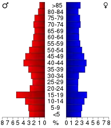 In the county, the population was spread out, with 24.70% under the age of 18, 8.40% from 18 to 24, 23.80% from 25 to 44, 22.40% from 45 to 64, and 20.70% who were 65 years of age or older. The median age was 41 years. For every 100 females there were 95.70 males. For every 100 females age 18 and over, there were 90.10 males.