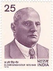 Sir Hari Singh Gour FRSL (26 November 1870 – 25 December 1949) was a distinguished lawyer, jurist, educationist, social reformer, poet, and novelist. Gour was the First Vice-Chancellor of the University of Delhi and Nagpur University, founder and Vice-Chancellor of the University of Sagar, Deputy President of the Central Legislative Assembly of British India, an Indian Delegate to the Joint Parliamentary Committee, a Member of the Indian Central Committee associated with the Royal Commission on the Indian Constitution (popularly known as the Simon Commission),[1] and a Fellow of the Royal Society of Literature.[2]