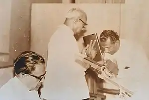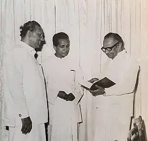 Dr. Harischandra Wijayatunga felicitation, 1979, for writing Modern Sinhala Technical Terms dictionary. (L) E. L. B. Hurulle, Cabinet Minister, Cultural Affairs, (middle) Cyril Mathew, Minister, Industry and Scientific Affairs, (L) Dr. Wijayatunga.