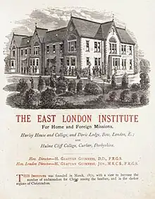 In 1872 Henry, Fanny and their six children were living in the East End of London. They started the East London Missionary Training Institute[2] (also called Harley College) at Harley House in Bromley-by-Bow, East End of London with just six students. The renowned Dr. Thomas Barnardo was co-director with Dr. Guinness and greatly influenced by him. The school trained 1330 missionaries for 30 societies of 30 denominations.