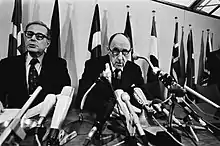 Harold Brown (September 19, 1927 – January 4, 2019) was an American nuclear physicist who served as United States Secretary of Defense from 1977 to 1981, under President Jimmy Carter. Previously, in the John F. Kennedy and Lyndon B. Johnson administrations, he held the posts of Director of Defense Research and Engineering (1961–1965) and United States Secretary of the Air Force (1965–1969).[2]