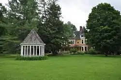 The house was built in 1889 for Edwin and Mary Harrington, both originally from Stockbridge. Harrington was a successful businessman who had had a successful career in Philadelphia. This house was built by a local contractor; its architect is not known. Edwin Harrington died in 1891; his wife expanded the number of buildings on the grounds, adding the carriage house and gazebo. After the Harrington ownership ended in 1910, the house was adaptively reused for commercial purposes, first as a medical sanitorium, and then as a bed and breakfast inn.[2] It has most recently housed a restaurant.