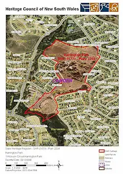 Currently the name "Harrington Park Estate" is used for the suburban area developed to the south of Narellan Creek, Stage 1 of a development which extends to the north of Narellan Creek. A 1997 proposal for an altered curtilage to the house was rejected by Camden Council. The direct relationship between the homstead group and its traditional landscape features, such as Narellan Creek and Crear Hill, has been recently compromised by intervening suburban development.[6][1] During the 1990s, the residential development continued. Construction of the third Harrington Park Village (Park Haven) was underway in 2005.[1] By 2011, Harrington Grove (north-east of the homestead) was nearing completion.[8][1]