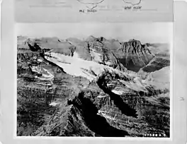 Harrison Glacier is a glacier located in the US state of Montana in Glacier National Park.[3] Situated on a southeast‐facing ridge immediately south of Mount Jackson, it is the largest remaining glacier in Glacier National Park, estimated in 2005 to have an area of 466 acres (1.89 km2).[2][4] Though many experts have stated that all the glaciers in Glacier National Park may disappear by the year 2030,[4] Harrison Glacier lost only 9 percent of its surface area in the 40-year period between 1966 and 2005 and will likely still exist well beyond 2030.[5] Compared to many of the vanishing glaciers in Glacier National Park, Harrison Glacier's accumulation zone is at a much higher altitude (approximately 9,000 feet (2,700 m)), which has allowed it to maintain some equilibrium in its glacier mass balance.[5] Comparisons of images of the glacier taken in 1913 with images from 2009 indicate that the glacier has experienced thinning and retreat.[6]