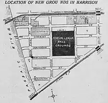 The stadium had a seating capacity of around 21,000.[1] It was a large ballpark, with dimensions of 375 feet in left, 450 feet to center and 375 feet in right;[2] these dimensions, and the fact that baseball was still in its "dead ball" era, made it difficult to hit for power. Just six home runs were hit in Federal League play in Harrison, and only one left the ballpark, hit by the Peps' Emil Huhn (his only career home run). Huhn would be better known as Fred Toney's catcher in the "double no-hit" game on May 2, 1917, where both Toney and Hippo Vaughn tossed no-hitters through nine innings. A crowd of 26,032 attended the opener on April 16, 1915;[3] subsequent crowds were in the 5,000-10,000 range.