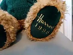 Harrods Christmas bears are signature plush toy bears created by the London department store Harrods and released every year to celebrate Christmas. They have been a tradition since 1986, and past bears are now considered valuable collectors’ items.[1] Harrods bears can be recognised by a mark on their left paw, which shows the Harrods logo and the year they were released.[2]