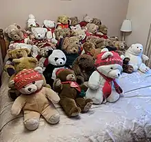 Since 1986, a bear has been released every year released in time for Christmas. Each bear wears a different outfit and care is taken to ensure that each year's bear is different to those from previous years.[3] In the early years, the bears did not have names. The first named bear, William, was released in 2003.[4] Since then, every bear released has his own name which is decided from a shortlist and is accompanied by a tag telling his story.[3] As the popularity of the bears grew, consumer demand led to all bears from before 2003 being retroactively given names[1]